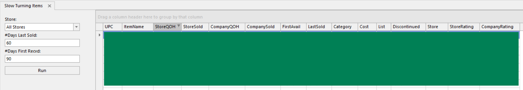 Identifies slow-moving items currently in stock at a location. Filter by store, days since last sale, and days since first received to find items that aren't selling. Shows store and company-wide quantity, ratings, and cost/list pricing.