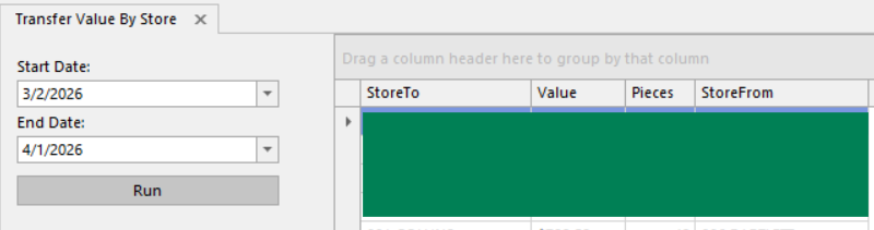 Shows the piece count and cost value of items transferred between store locations, summarized by sending and receiving store for the selected date range. Values are calculated using the item's catalog cost price at the time the transfer was ordered.
