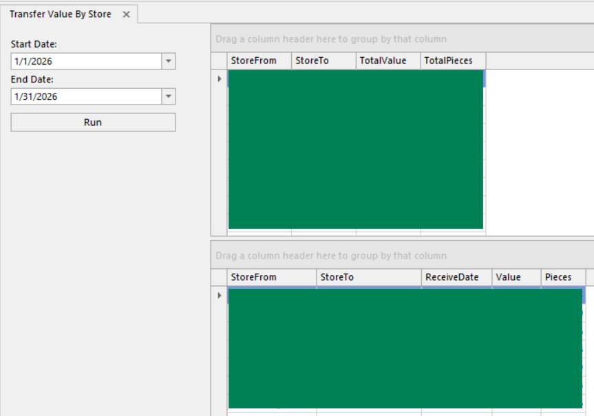 There are two versions of this report. Both show the piece count and cost value of items transferred between store locations for a selected date range, grouped by sending and receiving store.