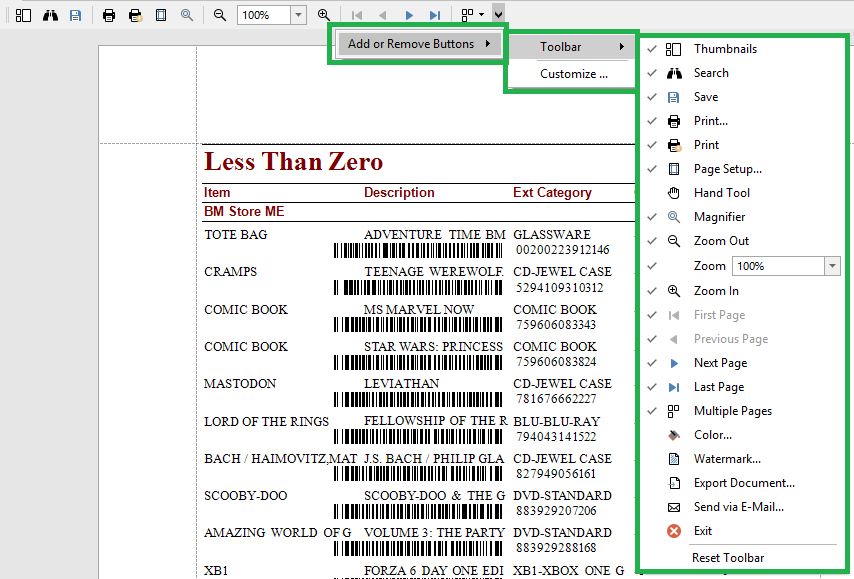 Reports group items first by condition (new or used), then format, and then the items are listed alphabetically. This is the best format to use for printing.